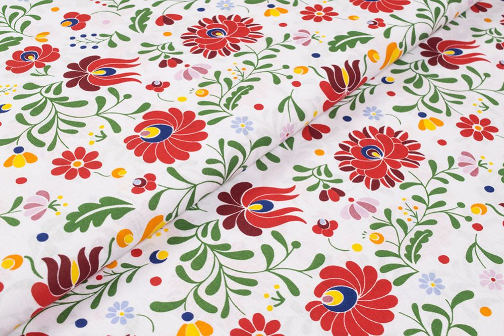 Bumbac cu model Tradițional maghiar cu flori mari pe alb